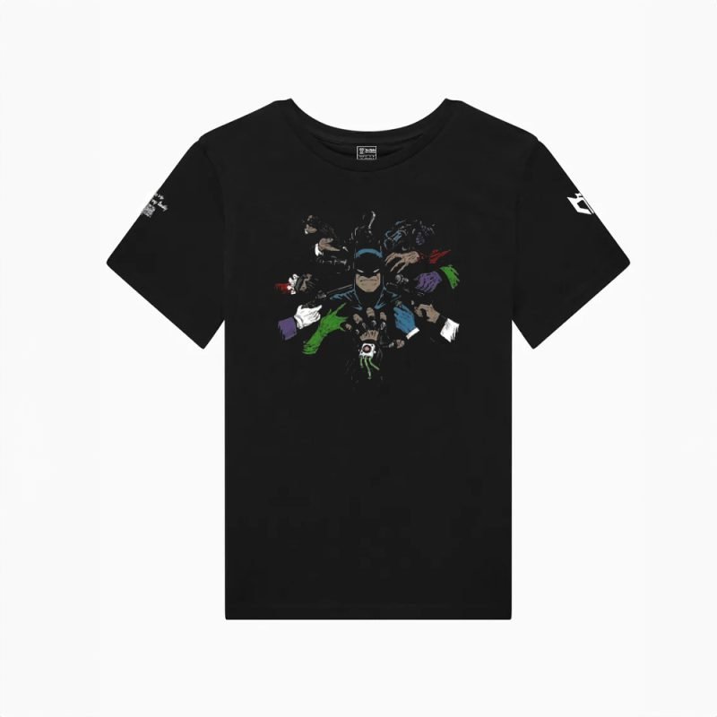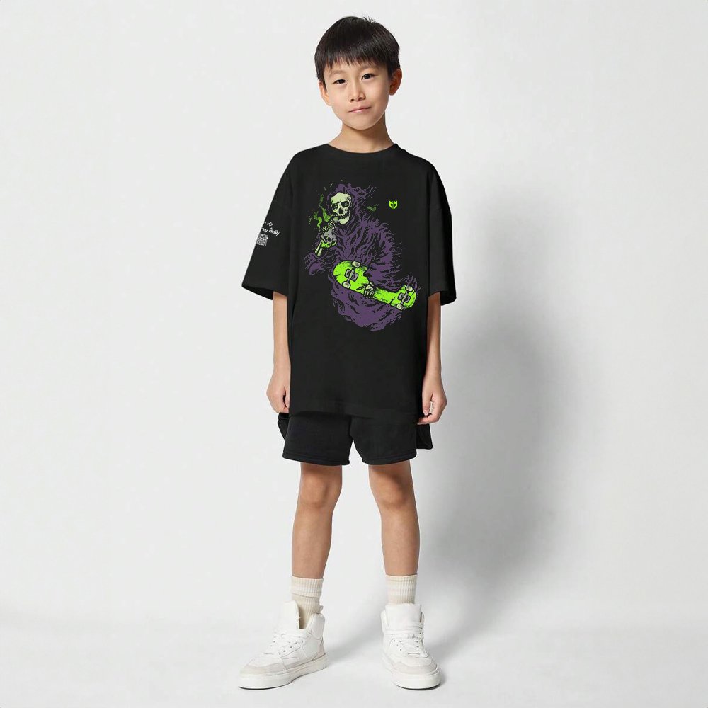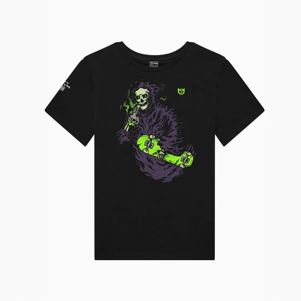 - تفاصيل التصميم: تيشرت أسود بطباعة جرافيكية لشخصية مخيفة ممسكة بلوح تزلج.