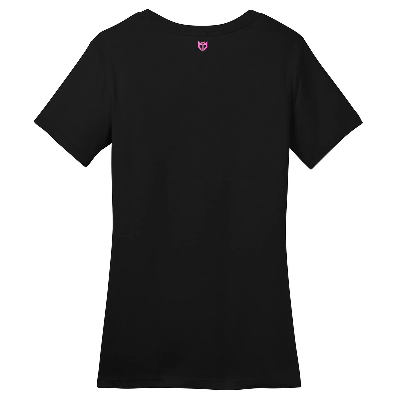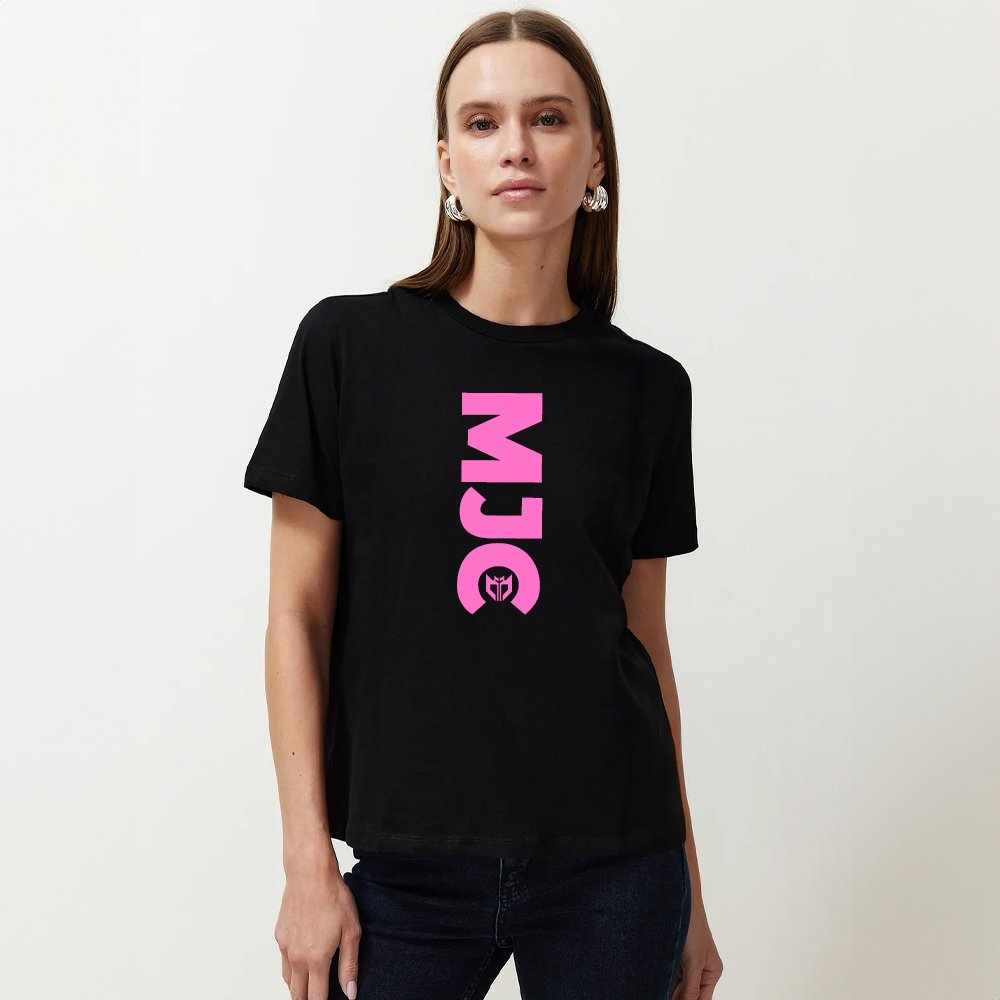 شعار MJC باللون الوردي الجريء بشكل عمودي على منتصف الصدر. -