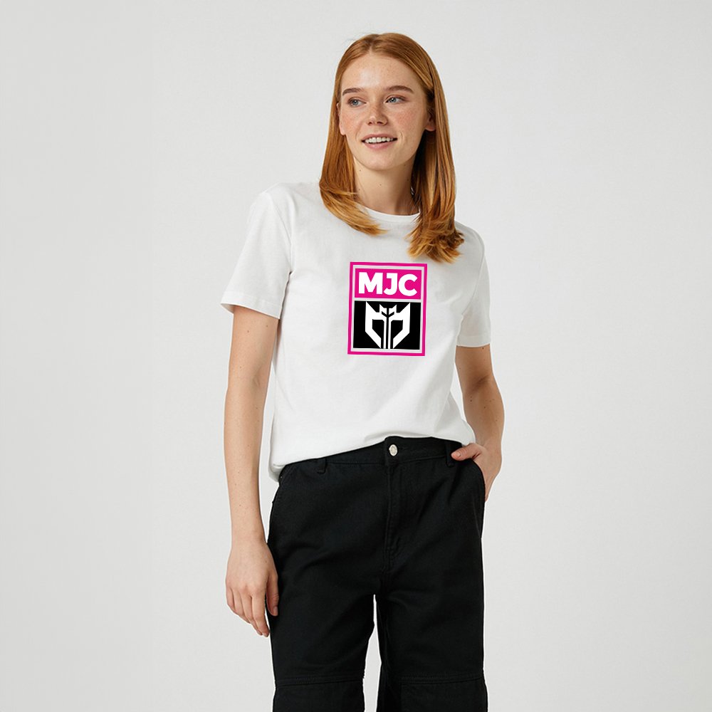 اطلبي الآن تي شيرت نسائي بأكمام قصيرة مع لوجو MJC وتمتعي بإطلالة مريحة وأنيقة في كل يوم!
