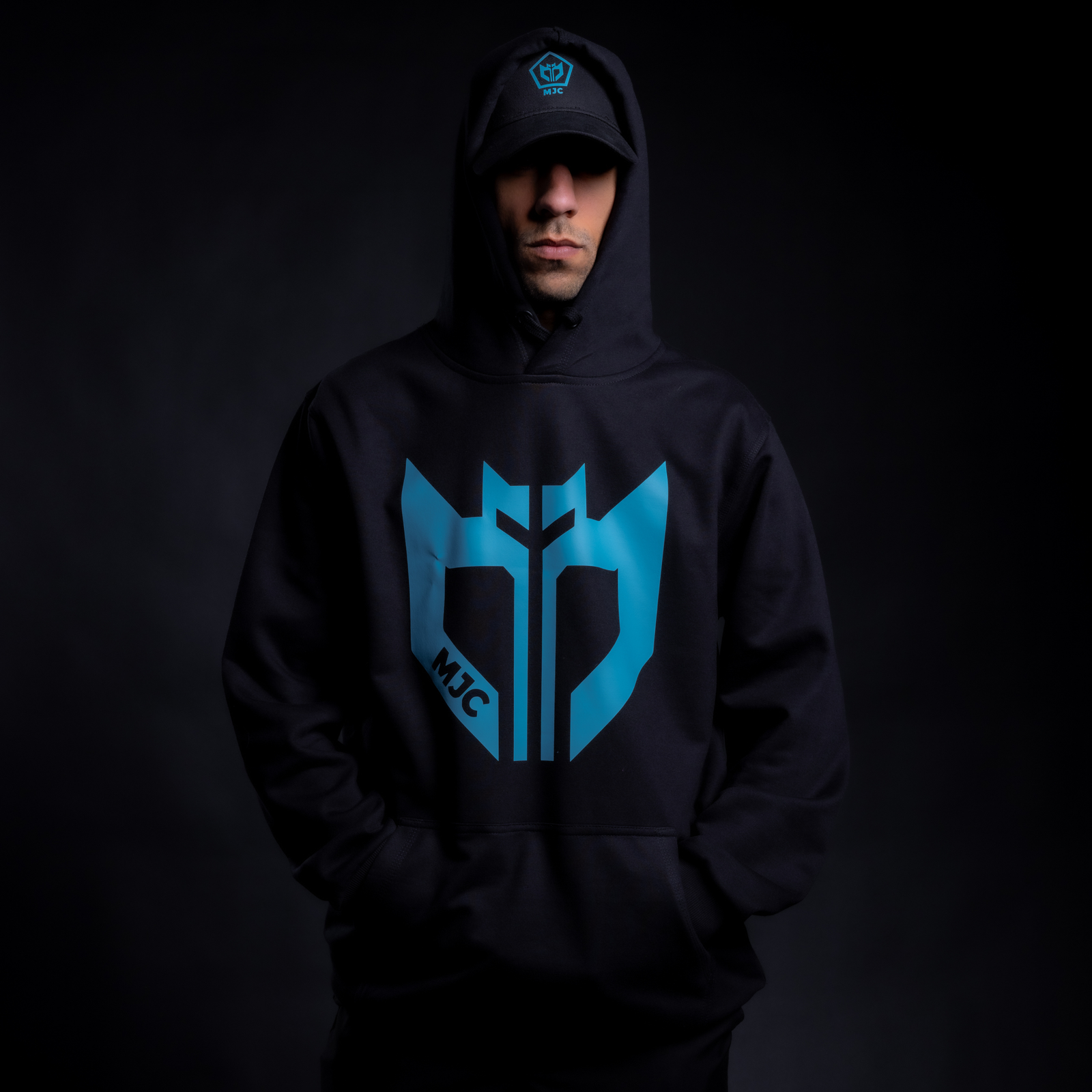 - هودي اسود مصمم باحترافية مميز بشعار باللون الأزرق الذي يُضفي لمسة من الأناقة والتميز.