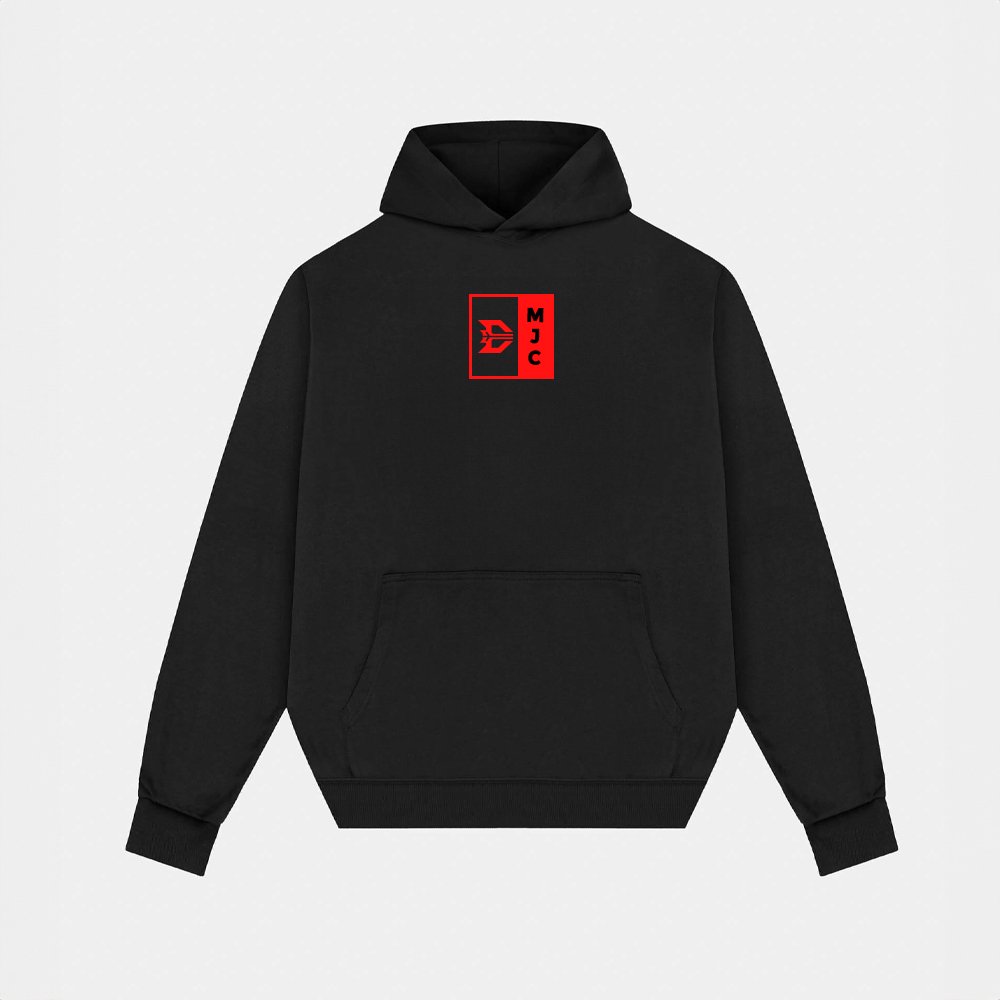 شعار MJC باللون الأحمر المشرق مطبوع على الصدر، مما يضيف لمسة من التفرد إلى التصميم البسيط. -