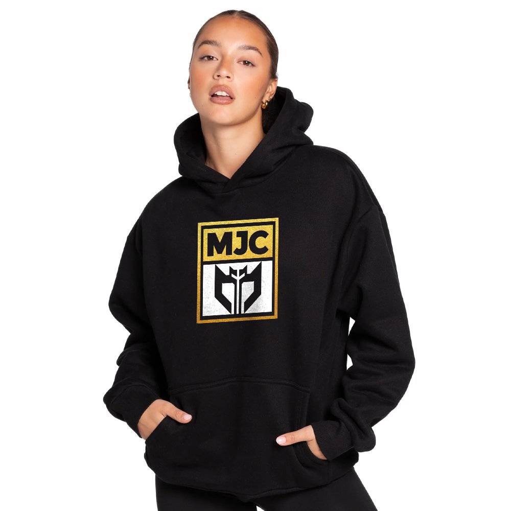 شعار MJC باللونين الأصفر والأسود في وسط الصدر، مما يضيف لمسة من التميز إلى التصميم. -
