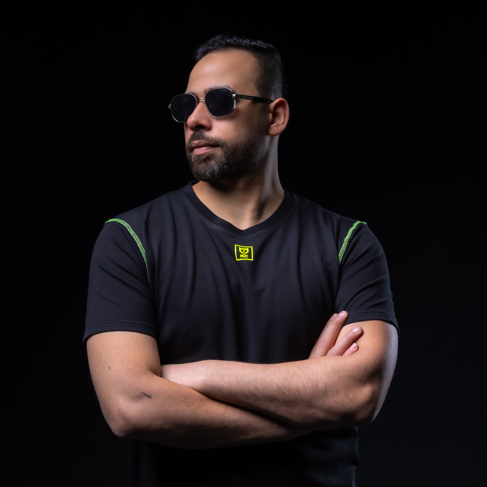 The T-shirt features a bold neon green accent on the shoulders, along with a simple yet distinctive MJC logo on the chest, adding a touch of modern style to your basic cotton t shirt.