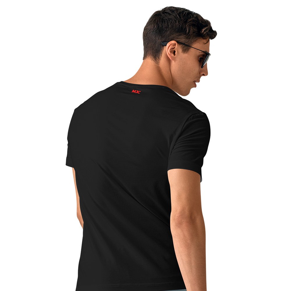 The black tee shirt features a striking red MJC logo on the chest, adding a bold contrast to the classic black fabric.